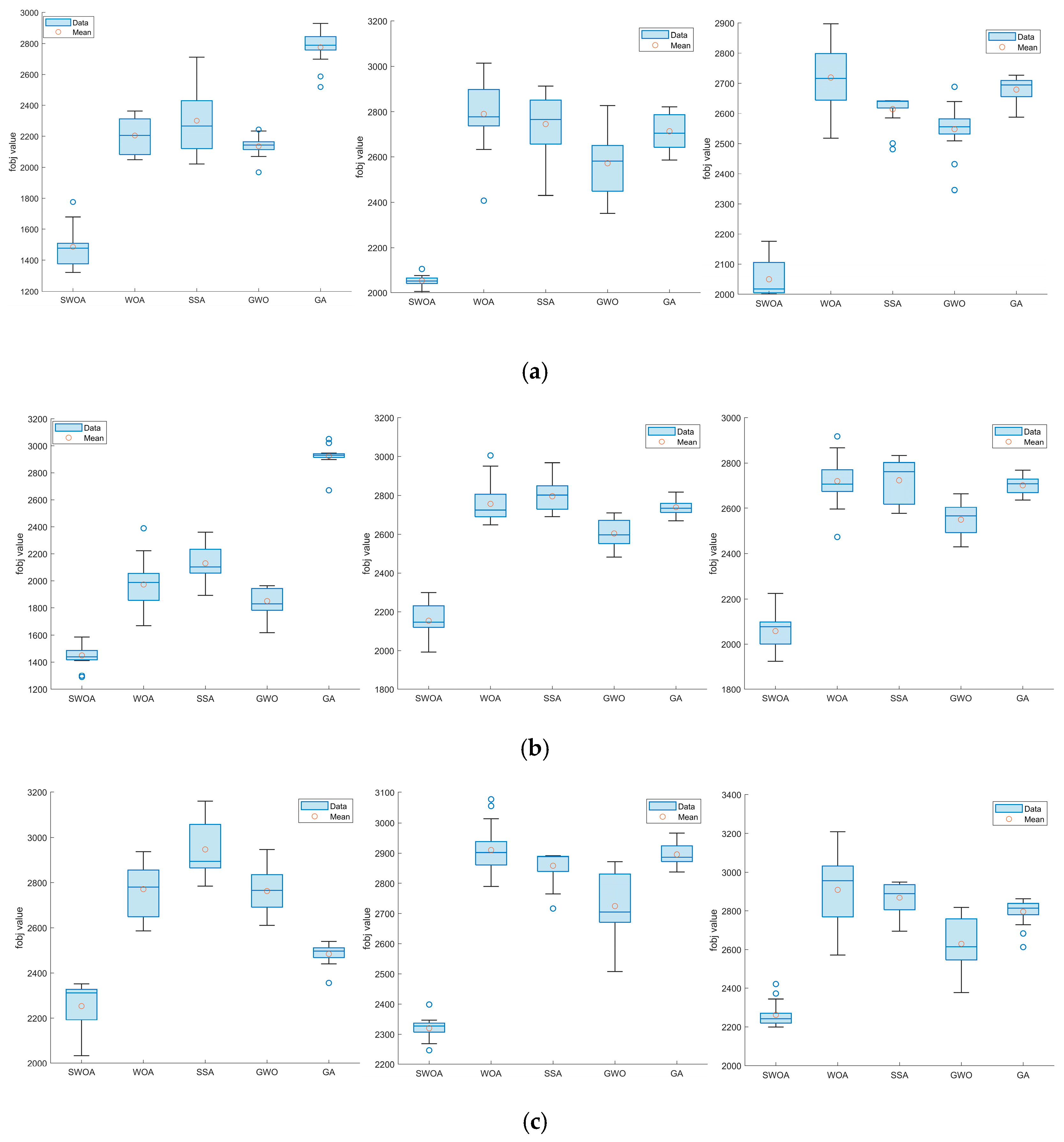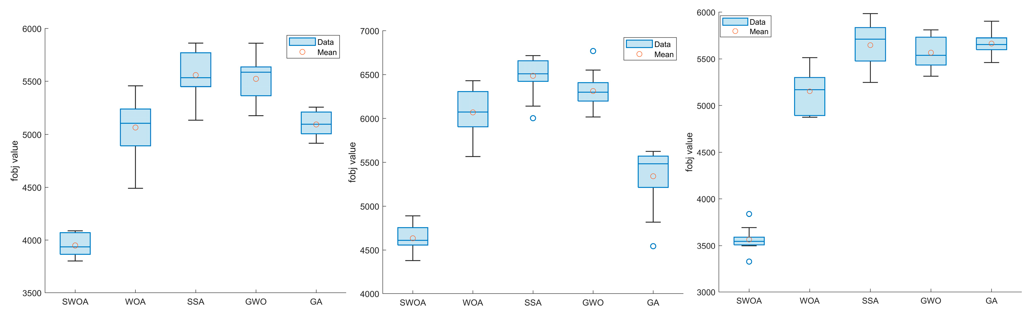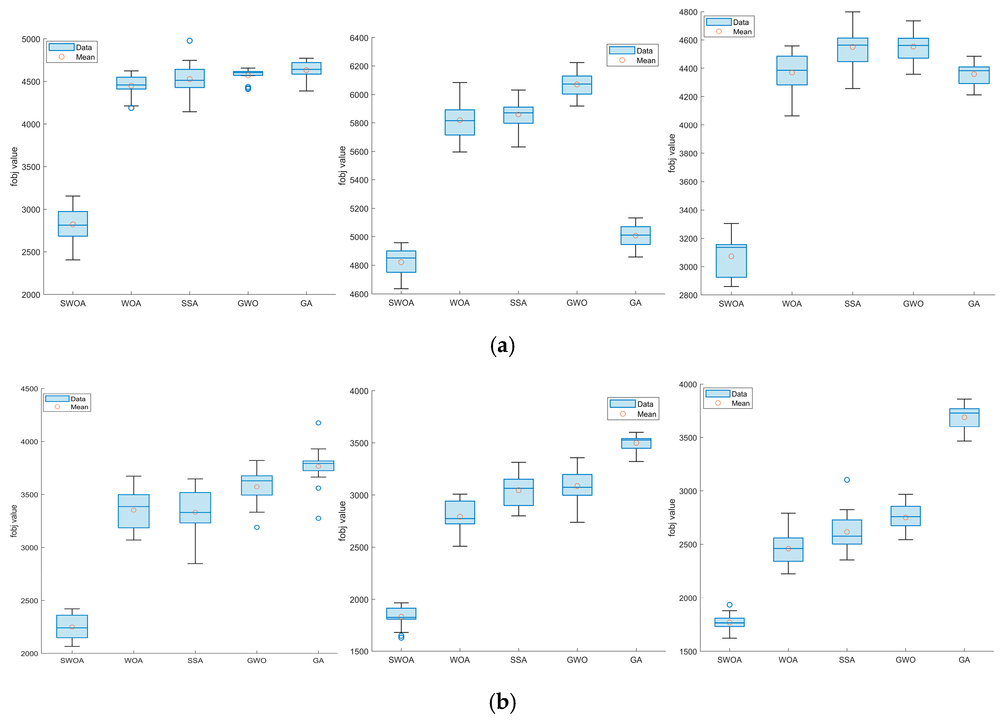 In the comparative experiments on Dataset I, the proposed S-WOA comprehensively outperforms the WOA, SSA, GWO, and GA algorithms in terms of the best, worst, and average solutions. Specifically, the results of S-WOA are significantly better than those of all the compared algorithms, with relative improvements exceeding 18% over the baseline performance, and it demonstrates better stability in most cases. Although the solving time of S-WOA is slightly longer than that of WOA and GWO, it remains within an acceptable range overall.