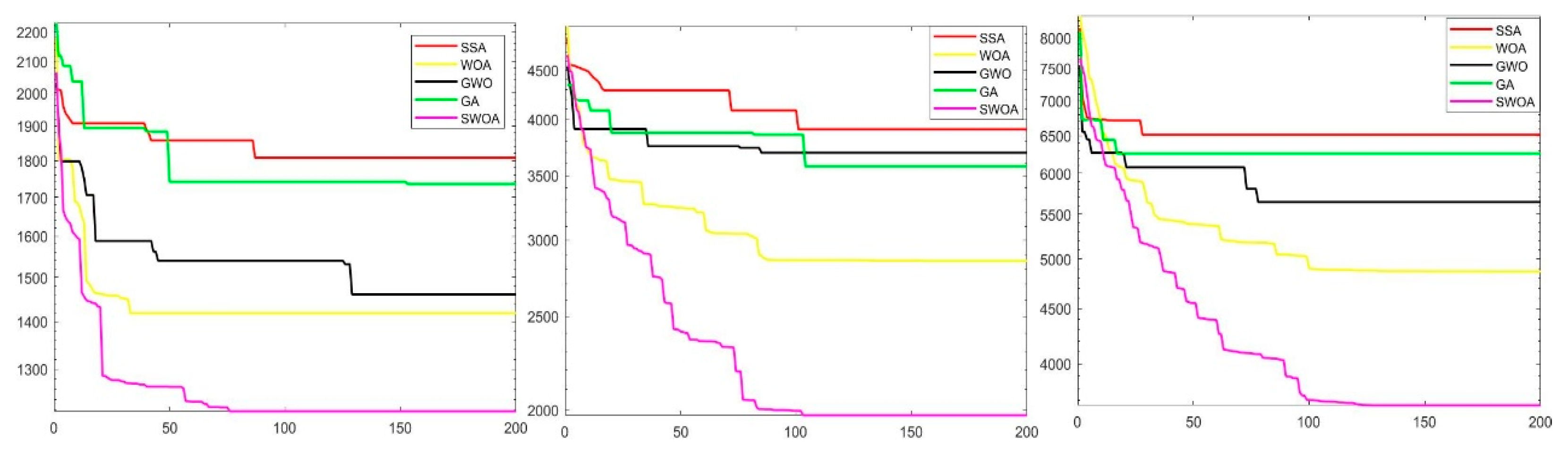 In the experiments on Dataset III, S-WOA similarly performs the best across all solution quality metrics: its best, worst, and average solutions outperform all the compared algorithms, with relative improvements exceeding 23%, and it demonstrates good robustness. Consistent with the previous results, its running time is slightly longer than that of WOA and GWO, which is primarily due to the enhancement mechanisms introduced in the algorithm.