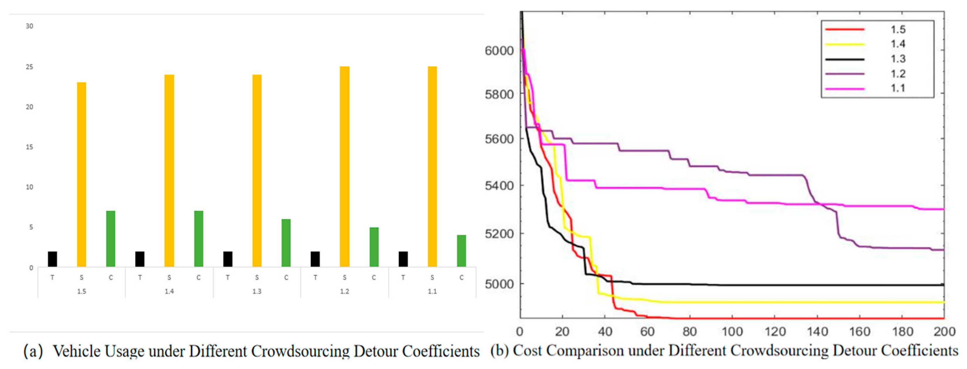 Figure 10a,b show the number of vehicles and cost graphs under different crowdsourcing detour coefficients, with 5 scenarios generated for detour coefficients ranging from 1.1 to 1.5.