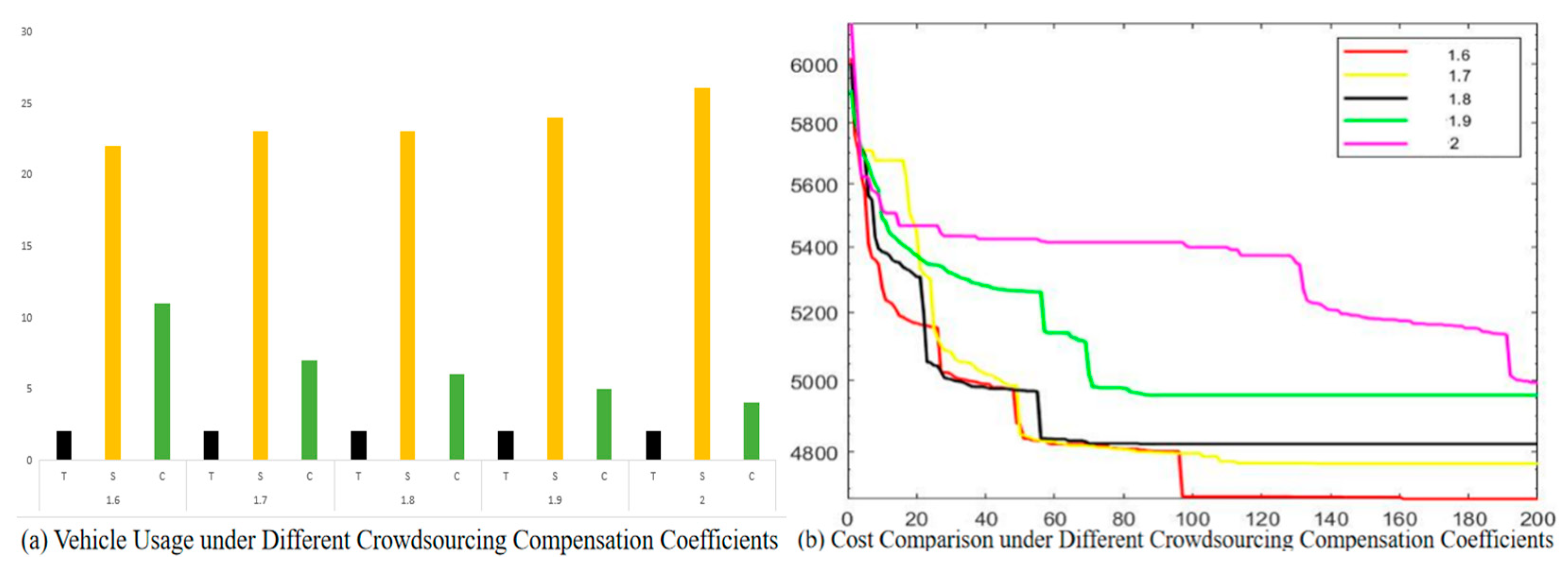 Figure 11a,b display the number of vehicles and cost graphs under different crowdsourcing compensation coefficients, with 5 scenarios generated for compensation factors ranging from 1.6 to 2. Here, T represents trucks, S specialized vehicles, and C represents crowdsourced vehicles.