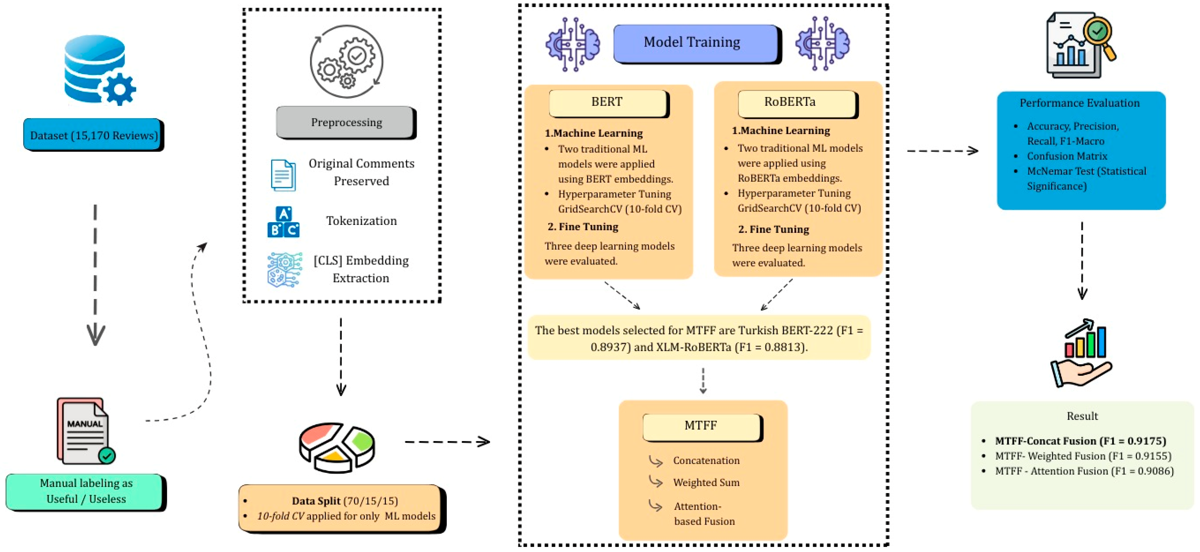 A comprehensive analysis of the existing literature reveals two key gaps: (i) most studies focus primarily on English datasets, and research on agglutinative languages remains limited, and (ii) Turkish studies predominantly concentrate on sentiment analysis [18,21,23], while the prediction of review usefulness has not been adequately explored. Addressing this gap, the present study evaluates both traditional ML methods (SVM, LR) and modern transformer-based architectures (BERT, RoBERTa, BERTurk) for usefulness classification in Turkish e-commerce reviews. Additionally, a novel Multi-Transformer Fusion Framework (MTFF) is proposed, incorporating three fusion strategies—concatenation, weighted sum, and attention-based fusion—to identify the most effective architecture.
