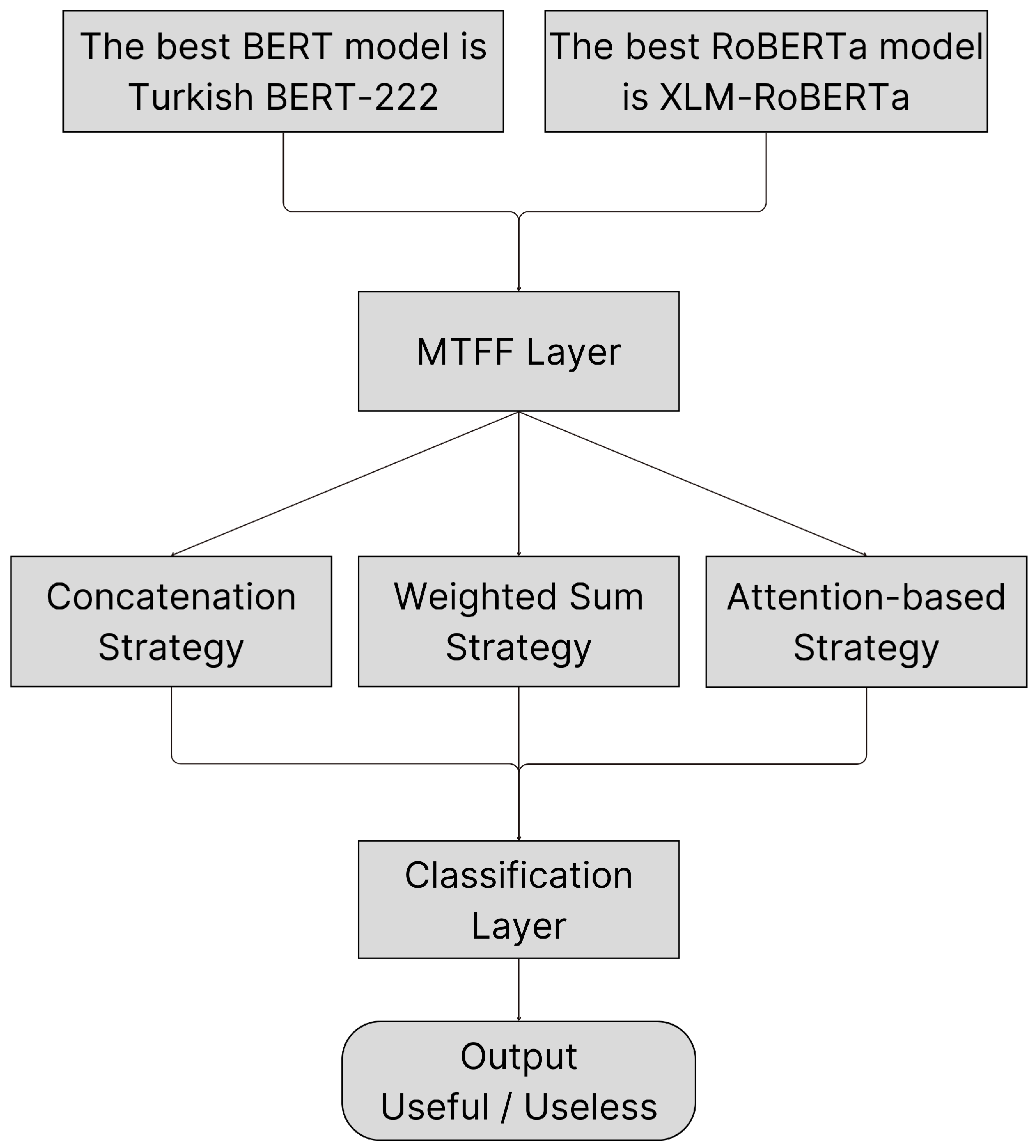 The proposed MTFF model in this study is a multi-transformer-based approach that combines the outputs of BERT and RoBERTa models using three different fusion strategies (concatenation, weighted sum, and attention). MTFF aims to achieve higher accuracy and generalizability in classifying Turkish e-commerce reviews. In this architecture, the Turkish BERT-222 and XLM-RoBERTa Base models, which demonstrated the highest performance in previous experimental stages, served as the basis. The general flowchart of architecture is illustrated in Figure 2.
