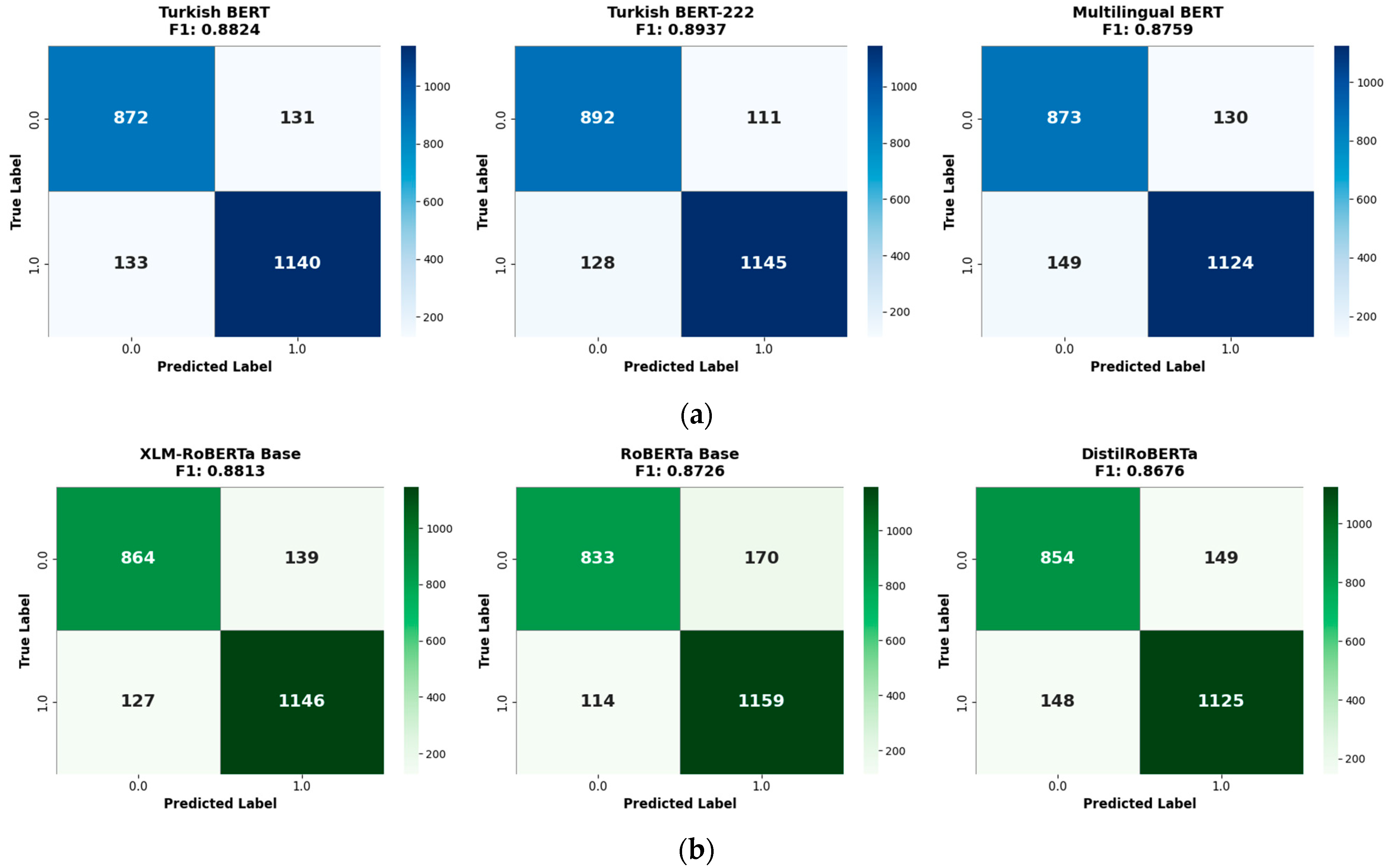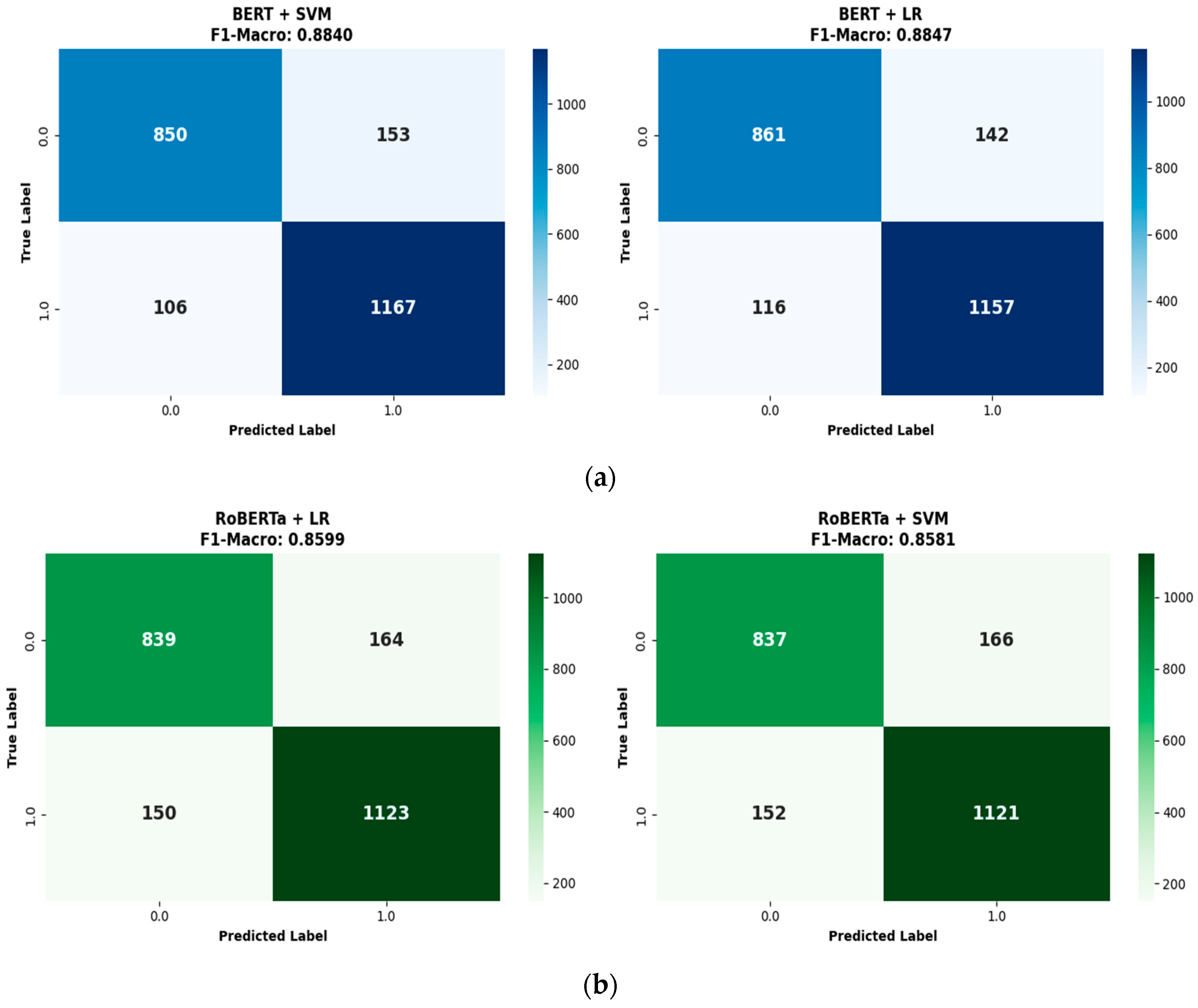 Figure 4. Confusion matrices for fine-tuning results of (a) BERT and (b) RoBERTa models.
