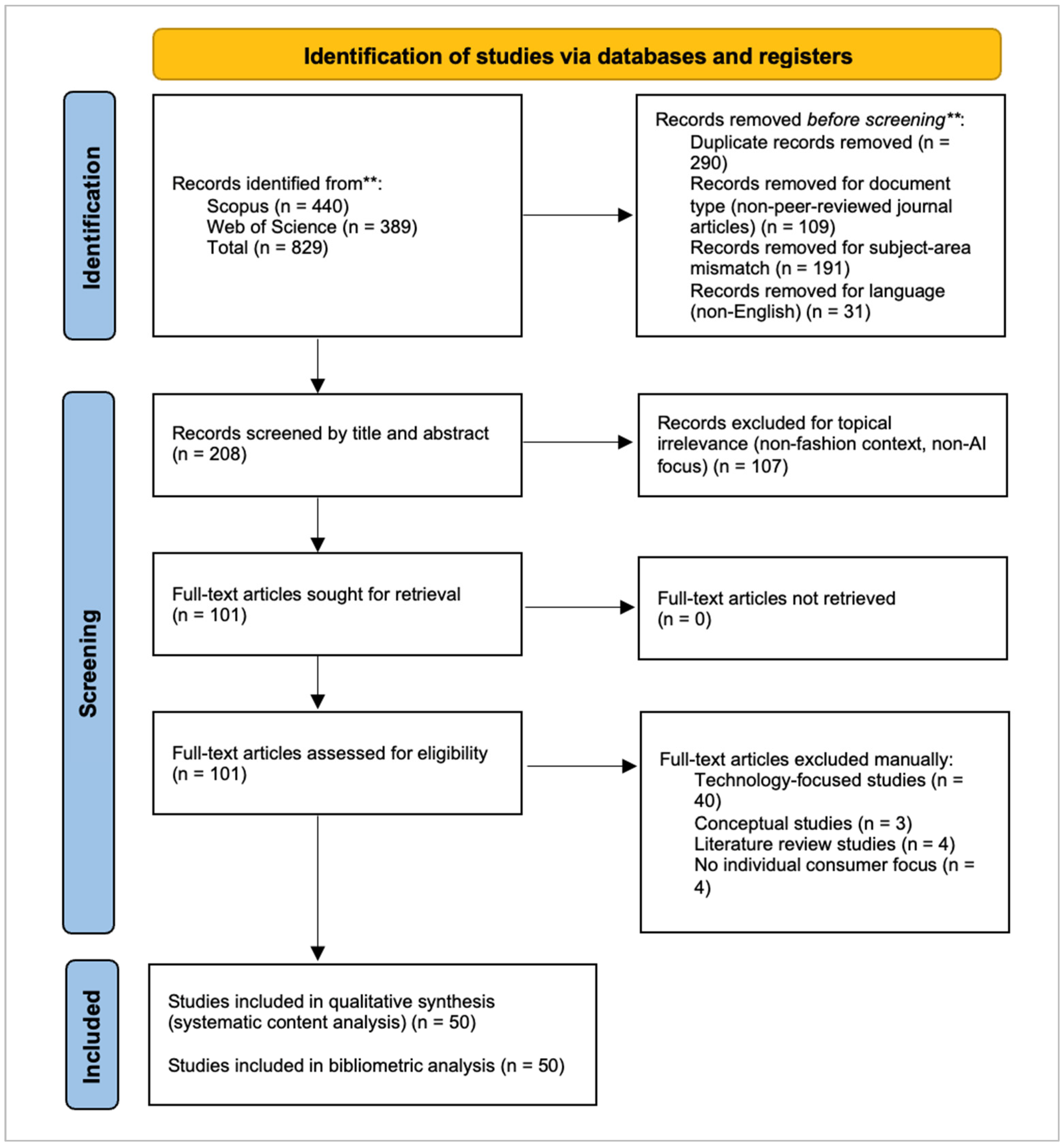 | This study | AI-driven consumer research in fashion | Systematic review combined with bibliometric analysis, guided by the TTM framework | 2022–2025 (GenAI era) | Provides the first integrated, TTM-guided synthesis of empirical consumer research in fashion, revealing structural landscape across research themes, theoretical foundations, and methodological approaches and proposing a TTM-informed future research agenda. |