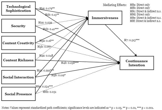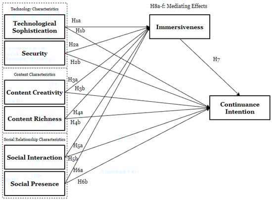 Building on this view, immersiveness is expected to be positively related to continuance intention and to function as a key experiential pathway through which favorable platform evaluations translate into continued use. Specifically, evaluations of technological sophistication, security, content creativity, content richness, social interaction, and social presence should be more likely to translate into continuance intention when they jointly support a more immersive experience. Thus, it is proposed that: