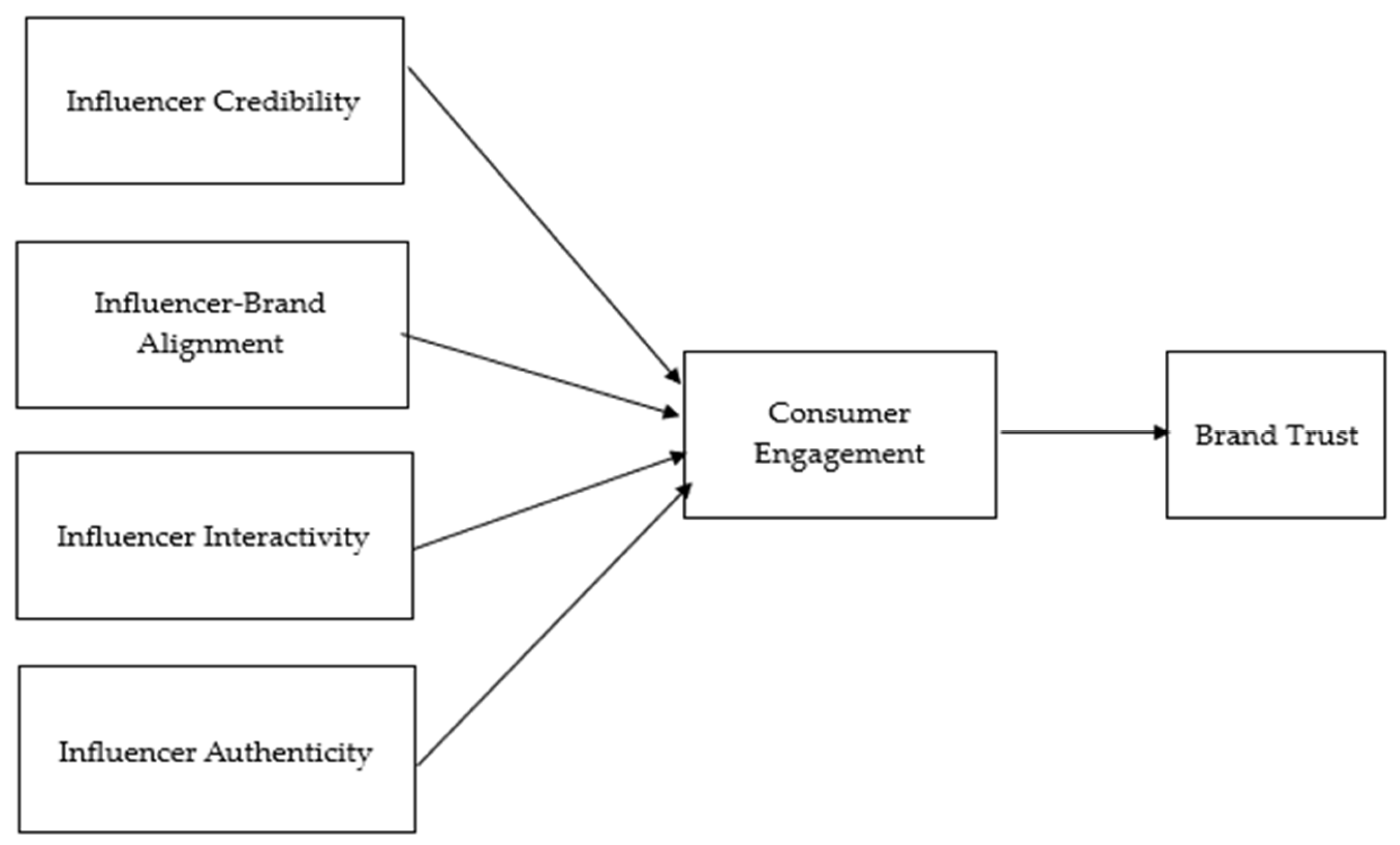 Given the great potential emotional attachment and authenticity have on the key issue of brand trust, this study intends to investigate the psychological mechanisms involved. In particular, it explores the contributions of influencer credibility, brand alignment, interactivity, and authenticity to consumer engagement and, subsequently, brand trust. As the existing literature is poorly integrated with diverging viewpoints, it is vital to construct a discussion around the key building blocks that connect influencers with their audiences. This study aims to shed light on how the underscored interplay can serve as a channel for mutual factors of brand and influencer growth. By that, this study is guided by the following questions: