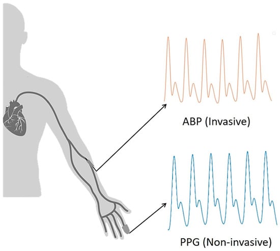 The objective of the paper is to estimate the ABP waveform using a PPG signal. Note that PPG can be measured non-invasively using a sensor in the fingertip, while ABP needs to be measured in an invasive way using an arterial catheter. The conventional measurement process of PPG and ABP signal is shown in Figure 1.