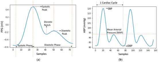 The properties of these PPG and ABP signals are shown in Figure 2a,b, respectively.