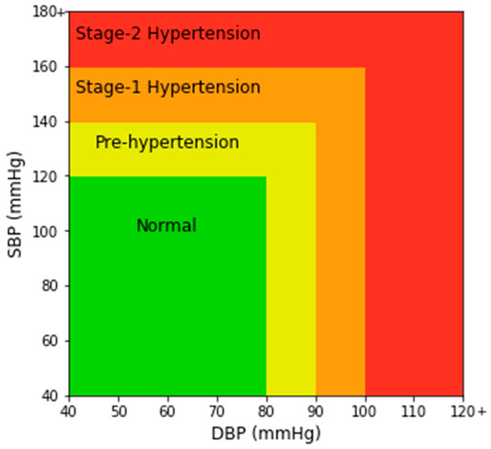 In Figure 2a, a single PPG signal is shown with a systolic peak, a diastolic peak, a dicrotic notch, and a systolic and diastolic phase. In Figure 2b, the highest peaks denote SBP and the valleys denote DBP. MAP is the average pressure in the arteries during a cardiac cycle. SBP is the maximum pressure within the large arteries when the heart muscle contracts to flow blood through the body. And DBP refers to the lowest pressure within the large arteries during heart muscle relaxation between each beat []. In Chobanian et al. [], four blood pressure ranges of a person are given based on SBP and DBP. The four ranges are normal, pre-hypertension, stage-1 hypertension, and stage-2 hypertension as shown in Figure 3.