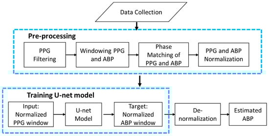 The overall architecture of our continuous and non-invasive ABP waveform estimation method is shown using a flow chart in Figure 4. First, the data were collected from databases. Then pre-processing was performed on the obtained data to remove artifacts from the signals. After that, the proposed modified U-net model was trained, validated, and tested with the pre-processed data. Finally, the ABP waveform was obtained from the PPG waveform using the trained U-net model.