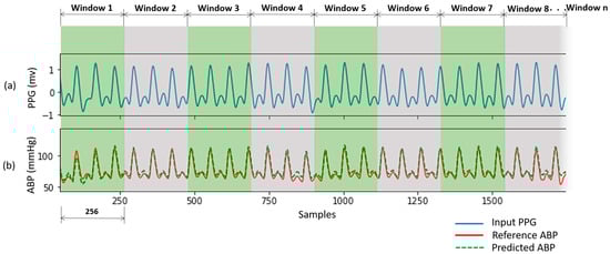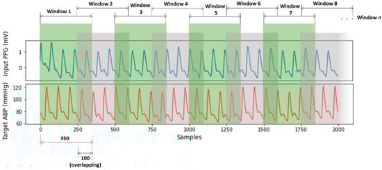 After PPG signal filtering, the PPG and ABP signals were divided into windows of 350 samples sequentially with overlapping of 100 samples in Figure 5. The window size and overlap value were selected empirically, and overlapping was performed to avoid missing information at the boundary of the windows. Windows containing artifacts, that are inaccurate for measurement, were identified and removed using a machine learning model for signal artifact detection [].