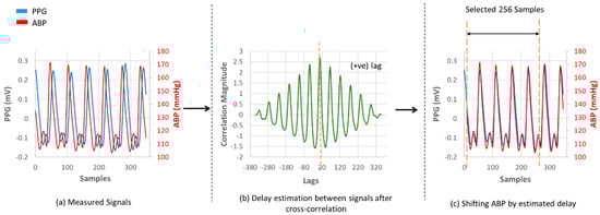 After that, the ABP and PPG signals were phase-matched according to their phase difference. There occurs a phase difference in PPG and ABP signals due to a path distance as illustrated in Figure 1. This phase difference is considered as a lag in signal analysis. The databases contain signals measured with different devices. So, to match the phase difference between the two signal windows, cross-correlation was performed. The location of the maximum value of the cross-correlation indicates a time lag. Keeping the PPG window fixed, the ABP window was shifted by the estimated time lag. The phase-matching process is shown in Figure 6. As the proposed U-net architecture’s input size is 256 samples, windows having less than 256 samples were not considered for our experiment, and windows having more than 256 samples were trimmed. The duration of each 256 sample window is 2.048 s.