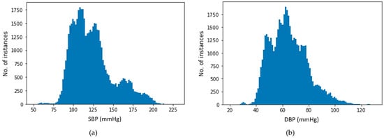 The preprocessed dataset was distributed widely from lowest to highest SBP and DBP values. Figure 7 illustrates the distribution of SBP and DBP values used for target values in our estimation process. The plots indicate that all SBP and DBP values for all of the four BP ranges are present in our dataset. After final preprocessing, approximately 195 h of data of 100 subjects were achieved. The final dataset contains on average 3.4 h of data for each subject.
