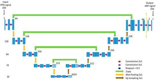 In Figure 8, the number on the left side of each block denotes the input vector size of that block. As our goal is to predict a properly shaped ABP signal, the input of the network is a PPG signal with a length of 256 samples of 1 dimensional (1D) convolution layer despite being 2 dimensional (2D) as the actual U-net architecture. In our modified network, each block takes an input that applies two 3 × 1 convolution layers followed by a Leaky Rectified Linear Unit (ReLU) activation function after each convolution layer and 2 × 1 max-pooling layer. The Leaky ReLU activation function was used to avoid the dying ReLU problem. The number of feature channels after each block doubles in the contracting path so that the architecture can learn the complicated structures effectively. The number on the upper corner side of a block denotes the number of feature vectors or channels. The bottleneck path uses two 3 × 1 convolution layers like before followed by a 2 × 1 up-sampling layer. The bottleneck path creates a feature space that automatically generates relevant features to give a proper output signal. Dropout of 50% was applied at the last layers of the contracting path and bottleneck path.