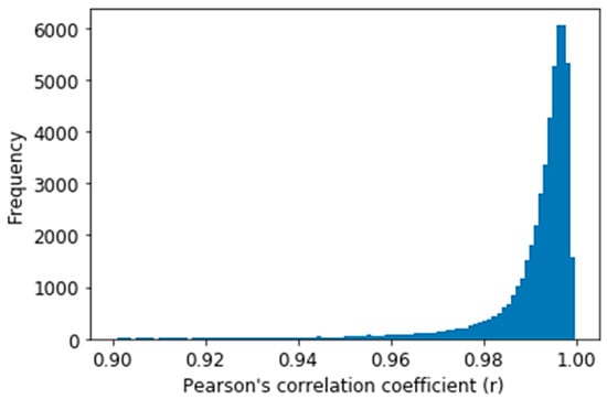 To evaluate our obtained ABP waveform result, Pearson’s correlation coefficient (r) was estimated between the predicted and reference ABP signals as this is used to measure the similarity between two-time series data []. The distribution of r for all the predicted signal windows in the test dataset is shown in Figure 10. Figure 10 shows that most of the values (X-axis) are between 0.9 to 1.0, which depicts high correlation of the predicted ABP signal with the reference signal windows. And from Table 1, the average Person’s correlation coefficient (r) value can be seen as 0.993. Before calculating the average, we performed Fisher-Z transformation and again performed retransformation after calculating the average to calculate the average r []. Table 1 also gives the value of the maximum and the minimum value of r for all the windows. The value of the 25th and 75th percentile of r says that our proposed U-net model predicted most of the waveform accurately.