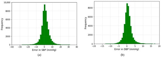The histograms of the prediction error using the modified U-net model for both SBP and DBP values are displayed in Figure 11.