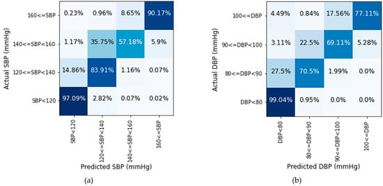 Prediction accuracy of (a) SBP and (b) DBP values in four BP ranges.