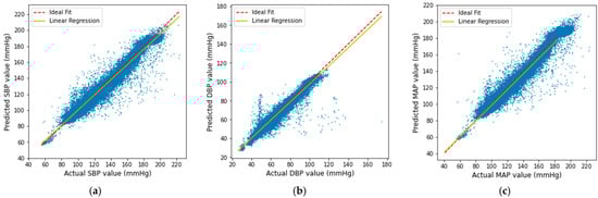 Linear regression plot of the (a) SBP, (b) DBP, and (c) MAP result.