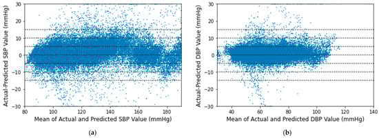 The Bland-Altman plots for the proposed algorithm are displayed in Figure 14 maintaining the AAMI criteria []. The x-axes represent pressure from 80 to 190 mmHg for SBP and 30 to 140 mmHg for DBP. The y-axes denote errors in the range of −30 to +30 mmHg. Reference horizontal dotted lines are shown at the interval of 5 mmHg from −15 to +15 mmHg. The mean of each actual BP and its relative predicted BP is plotted across their difference with a point. Greater than 30 mmHg differences are plotted at 30 mmHg and less than −30 mmHg are plotted at −30 mmHg. It is observed that most of the SBP and DBP errors lie between −5 to 5 mmHg in both cases.
