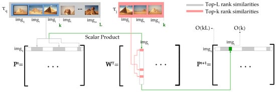 - Efficiency and Complexity Aspects: traditionally, diffusion processes compute the elements of affinity matrices through successive multiplications, considering all the collection images. To reduce the computational costs, sparse affinity matrices [] are employed for the first iteration. However, there is no guarantees that the multiplied matrices are also sparse and classic diffusion methods do not know in advance where the non-zero values appear in the matrices computed over the iterations. Therefore, a full multiplication of time complexity is required for each iteration. In opposite, the proposed method keeps the sparsity of matrices by computing only a small subset of affinities, which are indexed through rank information. First, the proposed method derives a novel similarity measure based only on top-k ranking information. Then, only the matrix positions indexed by the top-L rank positions () are computed. Inspired by [,], the overlap between ranked lists and, equivalently, between elements of rows/columns being multiplied is considered. Figure 1 illustrates this process for computing a matrix row, with sparsity depicted in white. The operation is constrained to top-L rank positions with time complexity of , and therefore for each row (with L constant), and hence for all rows, i.e., the whole dataset. Therefore, the method computes only a small subset of operations required by diffusion processes, reducing the conventional time complexity for the whole dataset from to .