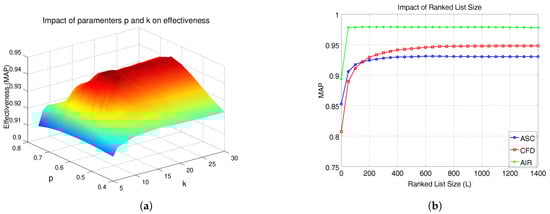 Parametric space analysis: impact of parameters p, k, and L on effectiveness. (a) Impact of parameters p and k. (b) Impact of ranked lists size L.