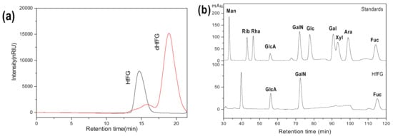 The purity and Mw of HfFG and dHfFG were examined by HPGPC using an Agilent 1260 series apparatus (Agilent Technologies, Santa Clara, CA, USA) equipped with a differential refraction detector (RID) and a Shodex OH-pak SB-804 HQ column (8 mm × 300 mm). The elution solvent was 0.1 M NaCl. The flow rate was 0.5 mL/min, and the temperature of the column was 40 °C. For Mw calculation, the Shodex OH-pak SB-804 HQ column (8 mm × 300 mm) was calibrated by a series of fucosylated glycosaminoglycan fractions from H. fuscopunctata with Mw of 39.9, 27.8, 14.9, 8.24, 5.30 and 3.12 kDa, determined by a size-exclusion chromatography with multi-angle laser light scattering [36].
