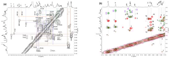 The 1H NMR spectra of Fr-1, Fr-2 and Fr-3 were similar, except for the differences in the integral area of the corresponding signals (Figure 3a–c). The 1D and 2D NMR spectra of Fr-2 were shown as representatives in Figure 4. The signals at 4.98 ppm and 4.95 ppm could be assigned to H-1 and H-4 of the T residue, according to the literature [22,32], indicating that the new anTal residue at the reducing end was formed. Six distinct signals were observed at the region of 5.2–5.7 ppm, which should be the anomeric protons of fucosyl residues varying in pattern of sulfation, as previously described [22]. According to the 1H-1H COSY spectrum (Figure 4a), the other H signals of the resonance systems could be further assessed (Table 1). The signals at 5.602, 5.261 and 5.315 ppm were assigned to H-1 of the Fuc2S4S (I’), Fuc3S4S (II’) and Fuc4S (III’) residues linked to GlcA in the middle of the backbone, respectively. Likely, the signals at 5.493, 5.273 and 5.187 ppm could be assigned to H-1 of the Fuc2S4S (I), Fuc3S4S (II) and Fuc4S (III) residues linked to GlcA at the non-reducing termini, respectively. The ratios of different sulfate patterns of FucS could be determined using integral intensities of the respective H-1 signals. The methyl of I’/II’/III’ was observed at 1.24–1.33 ppm, and those methyl protons (I/II/III) were found at 1.1–1.2 ppm (Figure 3a). The integral of these methyl signals could be accurately illustrated by the number of the trisaccharide-repeating units. Thus, Fr-1, Fr-2 and Fr-3 were mainly identified as hexasaccharide, nonasaccharide and dodecasachharide, respectively.