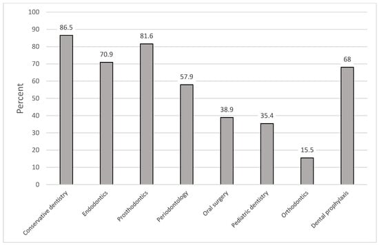 More than 80% of participating dentists worked in the fields of conservative dentistry and in prosthodontics, followed by endodontics (70.9%) and periodontology (57.9%) (Figure 1). Less than 40% performed oral surgery, pediatric dentistry, or orthodontics (15.5%). Nearly 70% offered dental prophylaxis.