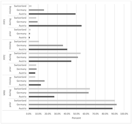 Significant differences could also be shown regarding the utilization of personal protective equipment. In Austria, respirators in FFP2 or FFP3 standard were used by 86.9% of participants compared to 56.7% of German and 61.2% of Swiss participants as standard at the first peak of infection (p < 0.001). Respirators in FFP3 standard were prioritized in Austria only (Figure 2). The difference in the utilization of masks could not be attributed to the indifferent access, since the lack of respirators was described mostly by Austrian participants, followed by German and Swiss respondents. In most COVID-19 related surveys dentists were asked about using FFP2/3 masks resulting in heterogenous outcomes. In North Italy, an area that suffered from high numbers of infection and the impending overload of the health care system, 58.84% of partaking dentists used respirators after the occurrence of the first infections; however, access to FFP2/3 masks was not evaluated in this study []. A survey conducted in dental staff in Norway showed that 22.9% of participants used a respirator in FFP2/3 standard while treating patients without suspected infection []. One aspect of this variation could be the different sensitization in regard to the COVID-19 pandemic in each country. Countries with a high incidence early in the pandemic, like Italy, or countries that were implicated in the dissemination of the virus, like Austria, possibly had a higher awareness during the first phase of the pandemic.