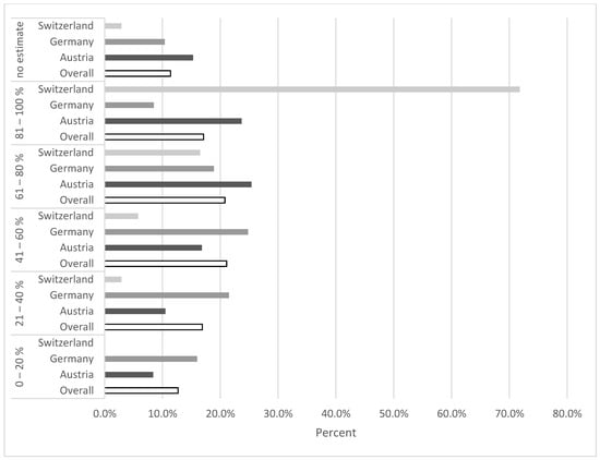 The COVID-19 pandemic and the countermeasures that the federal governments had enacted have resulted in substantial financial losses for most professions. The estimated financial loss in the most unprofitable month was rated in this study. 71.8% of Swiss participants estimated, that in the month associated with the greatest loss, their income dropped by 80–100%; 23.4% of Austrian respondents and 8.5% of German dentists assessed their financial loss as equally drastic (Figure 3).