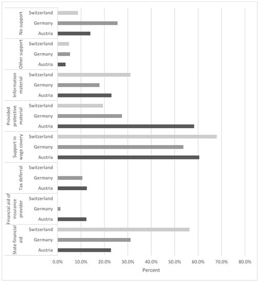 Support options in various forms were obtained by the majority of participants during the first peak of SARS-CoV-2 infections; 21.1% stated that they did not receive any aid. A measure that was used by a great part of respondents in all partaking countries was financial aid to cover wage costs; 60.5% of Austrian, 53.7% of German, and 68% of Swiss survey participants were supported accordingly (Figure 4).