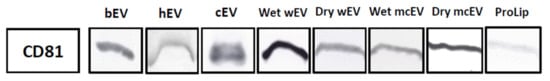 Extracellular vesicles were isolated using centrifugation and size exclusion chromatography (SEC) from milk and dairy fractions; raw unprocessed bovine milk (bEV), raw unprocessed colostrum milk (cEV), and wet and dry phospholipid enriched fractions using both a whey protein concentrate (wEV) and a micellar casein isolate (mcEV) as source material (Table 1). The EV isolation procedure has been described and verified in detail previously [], and all characteristics were in accordance with previously conducted EV separations from human and bovine milk. To confirm the presence of milk EVs in the isolates, Western blots against the classical EV biomarker CD81 were made []. Figure 1 shows that all bovine EV isolates were CD81-positive. Proteoliposomes also showed a weak band for CD81, which implies a minor presence of EV remnants in the used membrane protein fraction. Anyhow, the proteoliposomes were still considered as a valid control for milk EVs. Details about the conducted EV separations are given in the (Supplementary Materials Figures S1 and S2).