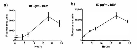 Uptake studies were performed to evaluate whether there was a dose- or time-dependent uptake of bEVs. The cells were stimulated with either 10 µg/mL or 50 µg/mL bEVs for 0–24 h. Figure 2 shows an increase in the fluorescent signal depending on the bEV concentration, with the higher bEV dose resulting in a higher signal. It was observed that a maximum bEV uptake was reached after 18 h with both bEV concentrations. Up to 4 h of incubation with 50 µg/mL of bEV, the RAW264.7 cells showed a rapid increase in bEV uptake. These results indicated that 4 h of incubation with 50 µg/mL of bEV protein was sufficient time for RAW264.7 cells to take up the bEVs.