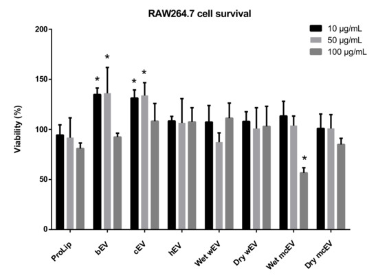 The potential cytotoxicity of the different EV isolates on RAW264.7 cells was analyzed by an MTT viability assay. Figure 3 shows that the EV treatments did not affect RAW264.7 cell viability after 4 h of incubation. Treatment with bEV and cEV increased survival significantly compared to the control (proteoliposomes). Treatment with high amounts (100 µg/mL) of wet mcEV resulted in the lowest cell survival, whereas the lower doses of wet mcEV had no effect on cell viability. All other EV samples showed no significant change in viability as response to EV incubation for 4 h.