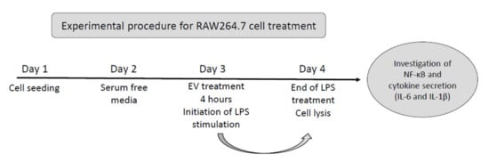 Experimental procedure for cell experiments. Initially, RAW264.7 cells were seeded in a 6-well plate and starved for 24 h to avoid effects of serum constituents before EV treatment for 4 h, followed by 18 h of LPS stimulation. Cell culture supernatant and cell lysate were harvested and used for IκBα Western blots and cytokine assays.