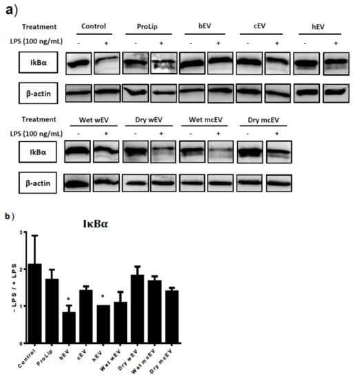 To investigate activation of the NF-κB pathway in RAW264.7 cells as response to LPS treatment, degradation of IκBα was investigated. Cells with an active NF-κB pathway degraded IκBα, as observed in the control (Figure 5a). Quantifications of the Western blots are shown in Figure 5b. It shows fold change in the IκBα level (non-LPS-treated/LPS-treated cells), thereby showing the difference in activation of the NF-κB pathway. RAW264.7 cells pre-treated with bEV or hEV showed no change in IκBα level after treatment with LPS, and these treatments resulted in a significantly lower activation of the NF-κB pathway compared to the control. Treatment with cEV or wet wEV did not result in a statistically significant decrease in IκBα degradation compared to the control.