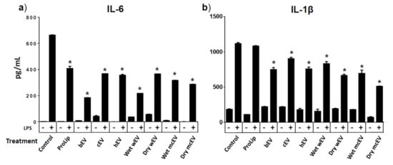 RAW264.7 cells’ production of cytokines as response to LPS stimulation was measured after preincubation with the different EV isolates. All EV treatments, including the proteoliposome control, resulted in significantly less secretion of the proinflammatory cytokine IL-6 in LPS-stimulated RAW264.7 cells (Figure 6a). The largest reduction was seen after preincubation with bEV and wet wEV. The amount of the proinflammatory cytokine, IL-1β, produced by EV-preincubated LPS-stimulated RAW264.7 cells is shown in Figure 6b. The same tendency is observed here: all EV treatments resulted in a lower production of cytokine with a significant difference from the control. LPS-stimulated RAW264.7 cell preincubated with proteoliposomes did not result in a statistically significant reduction of IL-1β production.