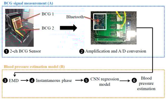 The most frequently used cuffless methods of estimating BP use electrocardiograms (ECGs), photoplethysmograms (PPGs) [], or dual PPG [] signals. The pulse transit time (PTT) and pulse wave velocity (PWV) extracted from these signals are known to be highly correlated with BP [,]. Conventional methods of measuring PPG and ECG signals attach sensors to fingers (PPG) or electrodes to the body (ECG). However, many non-intrusive signal measurement methods have been developed recently, providing a convenient method for users to measure signals [,]. Ballistocardiogram (BCG) signals are bio-signals, which can be used to determine the heart rate and respiratory rate of users non-intrusively []. BCG signals are difficult to analyze because they have non-linear and non-stationary characteristics; however, the BCG-based PTTs are highly correlated with BP [,].