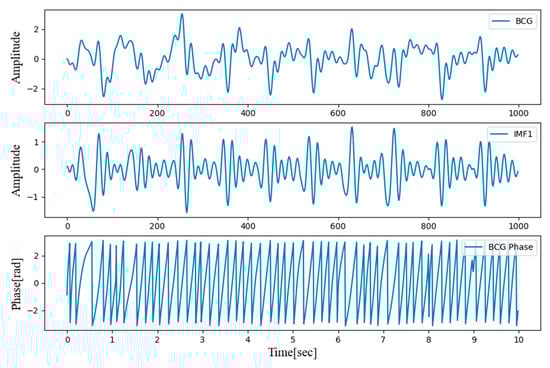Filtered BCG signal, first intrinsic mode function (IMF) extracted using the empirical mode decomposition (EMD) algorithm, and BCG phase calculated by Hilbert Transform.