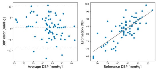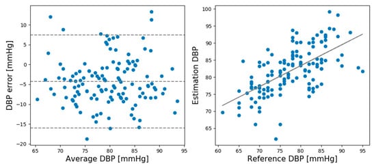 In the rest session, the ME and SD of the predicted and actual BP values of the SBP prediction model were 0.93 and 6.24, respectively, while the ME and SD of the DBP prediction model were 0.21 and 5.42, respectively. In the recovery session, the ME and SD of the predicted and actual BP values of the SBP prediction model were −1.12 and 8.74, respectively, and the ME and SD of the DBP prediction model were −0.728 and 4.87, respectively. Comparing the ME and SD between the rest and recovery sessions shows that the proposed model performed better for the rest session than the recovery session except DBP standard deviation. Figure 5 shows Bland–Altman plots for the SBP estimations made by the CNN model in the rest session. Figure 6 shows the Bland–Altman plots for the DBP estimations made by the CNN model in the rest session. Figure 7 shows the Bland–Altman plots of the SBP estimations made by the CNN model in the recovery session. Figure 8 shows the Bland–Altman plots of the DBP estimations results made by the CNN model in the recovery session.