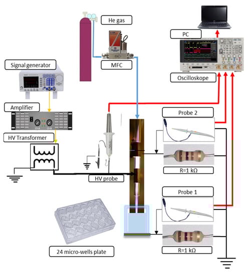 Figure 1 illustrates the schematics of the dielectric barrier discharge (DBD) atmospheric pressure plasma jet (APPJ) setup and the plasma treatment of a medium placed in the well of a 24-well plate. The DBD jet consists of a glass tube with an inner diameter of 4 mm and an outer diameter of 6 mm. The two electrodes placed around the tube are 15 mm wide and made of copper tape. The surface of the target grounded through a resistor served as the third electrode. The electrode positioned at 5 mm from the edge of the glass tube was connected to the power supply. Another grounded electrode was placed at a distance of 10 mm from the powered electrode. This electrode was grounded over a second resistor to the same point of the electrical circuit as the ground line of the target. The power supply of the APPJ consists of a function generator (PeakTech DDS Function Generator, PeakTech GmbH, Ahrensburg, Germany), a home-made amplifier, and a high-voltage transformer operating at its resonance frequency of 81 kHz. A sine-wave high-voltage signal was provided to power the APPJ. One high-voltage (HV) probe (P6015A HV probe, Tektronix Inc., Beaverton, OR, USA) and two voltage probes (N2863B voltage probe, Agilent, Santa Clara, CA, USA) were used to record voltage and current waveforms. The current waveforms were obtained at the resistors (R = 1kΩ) in the grounded branches of the electrical circuit. They were used to monitor the stability of plasma and calculate the power delivered from the plasma to the sample. This power was 1.2 W in all experiments. The RMS voltage was 1.9 kV and the RMS current was 2.2 mA. The APJ was operating with 2 slm of He as the working gas. The distance between the ending of the APPJ tube and the surface of the sample was 5 mm in all experiments. After the sample treatment, the production of RONS in PAM was investigated by spectrophotometry and colorimetric methods and the concentrations of nitrite ions, nitrate ions and hydrogen peroxide were determined. The pH value of the PAM-RPMI 1640 was not changed after the plasma treatment.