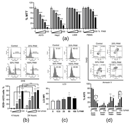 Dose dependent cytotoxicity of PAM. (a) Metabolic activity of A375, Hep2, L929, PBMC was assessed by MTT assay after 24 h treatment with serial dilutions of PAM (0% (white bars), 6%, 12.5%, 25%, 50% and 100% (black bars)) in complete RPMI medium. The results are shown as % MTT relative to the non-treated corresponding control cells 100%. Data from two independent experiments, each carried out in triplicates, are shown as the average % of MTT ± SD. (b) A representative data on the measurement of oxidative stress by DHE in A375 cells cultivated in the presence different concentrations of PAM for 4 h is shown. The summarized data from two independent experiments, in which the oxidative stress with the different doses of PAM (0% (white bars), 12.5%, 25%, 50% and 100% (black bars)) was measured after 4 h or 24 h as indicated, is shown as mean % of ROS+ cells ± SD. (c) A representative histograms on measurements of membranous LC3 expression in permeabilized A375 cells is shown with the indicated total mean fluorescence intensity (MFI), and the summarized data from two experiments is shown as MFI of LC3 ± SD. (d) Analysis of cell death by Annexin V/7AAD staining (AnnV−7AAD− viable; AnnV+7AAD− early apoptosis; AnnV+7AAD+ late apoptosis; AnnV−7AAD+ necrosis) in A375 cells is shown, carried out after 24 h cultures in presence of different doses of PAM (0%, 12.5%, 25%, 50%, 100%). Representative dot-plots and summarized data are shown as mean % A375 cells ± SD of 3 independent experiments. * p < 0.05, ** p < 0.01, *** p < 0.005 compared to non-treated control cells (0% PAM) or as indicated by line.