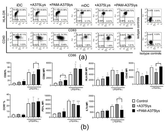 Effects of PAM-treated A375 lysates on phenotypic properties of DCs. Immature DCs differentiated for 4 days in the presence of GM-CSF/IL-4, were treated with the A375 lysate or the PAM-A375 lysate at 1:1 A375: DCs ratio, and after 4 h they were stimulated with LPS/IFN-γ or not, for the next 16 h. (a) A representative experiment on CD83/HLA-DR and CD40/CD86 co-expression analysis is shown and, (b) the summarized data from 3 independent experiments (different DC donors) are shown for the % of cells expressing the indicated surface marker, or as mean fluorescence intensity (MFI), ± SD. * p < 0.05, ** p < 0.01, *** p < 0.005 vs corresponding control DCs (white bars) or as indicated with lines (RM-ANOVA, Tukey’s multiple comparison test). Statistical significance between the corresponding iDCs and mDCs was not indicated for clarity.