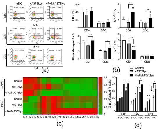 DC-mediated induction of an efficient anti-tumor response involves their increased capacity to induce Th1 and/or Th17 cells []. Therefore, the immunogenic properties of DCs loaded with A375 lysates were next investigated in co-cultures with allogeneic T cells to evaluate their T cell polarization capacity (Figure 6). It was found that PAM-A375lys-treated mDCs significantly increased the proportion of Th17 cells (IL-17A+ CD4+ T), IL17+ CD8 T cells and cytotoxic CD8 (IFN-γ+ Granzyme A+ CD8+) T cells compared to both control mDC and A375lys-treated mDC. According to the unaltered IL-12 production by PAM-A375lys-treated mDCs (Figure 4b), and its role [], we also did not find altered proportions of Th1 (IFN-γ+ CD4+T cells) cells in co-culture with these DCs. In contrast, control A375lys-treated DCs reduced the proportion of Th1, Th17 and cytotoxic CD4 T cells (IFN-γ+ Granzyme A+ CD4+) compared to control mDCs, probably due to their increased capacity to secrete IL-10, which is known to inhibit Th1 and Th17 polarization []. Moreover, PAM-A375lys-treated mDCs significantly reduced the proportion of Th2 (IL-4+ CD4+) cells compared to mDCs, unlike A375lys-treated mDCs (Figure 6a,b). In general, mDCs induced lower levels of Th2 cytokines (IL-4, IL-5, IL-13) and higher levels of IL-6, Th9 (IL-9), Th1 (IFN-γ, IL-2, TNF-α) and Th17 (IL17A, IL17F, IL21, IL22) cytokines in DC/T cell co-culture supernatants, as compared to co-cultures with imDCs (Figure 6c). Thereby, PAM-A375lys-treated mDCs were the most potent in relatively lowering the Th2 and increasing the Th1 and Th17 cytokines in co-culture supernatants, confirming that PAM-treated tumor lysates potentiate beneficial anti-tumor properties in DCs. In line with this, Th2 cells demonstrated pro-tumorigenic effects in a mouse tumor model, whereas Th1 and Th17 cells displayed the opposite effects [,]. PAM-A375lys-treated mDCs also displayed a significantly higher capacity to stimulate proliferation of allogeneic T cells compared to A375lys-treated mDCs (Figure 6d). These results are in line with the higher levels of IL-2 detected in PAM-A375lys-DC/T co-cultures, better maturation of PAM-A375lys DCs, and their stronger IL-12 production, all of which are critical for the induction of T cell proliferation [,,].