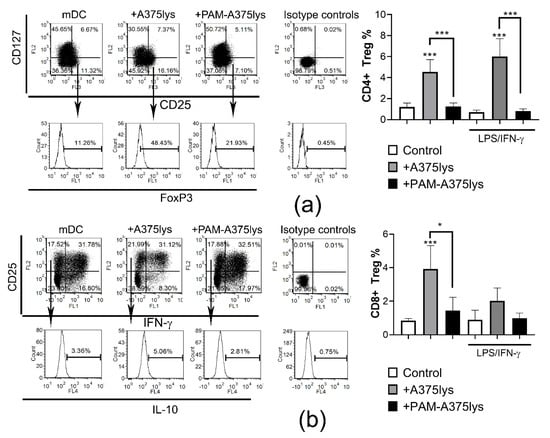 An efficient immunogenic DC vaccine ought to potentiate the Th1/Th17 response in T cells, but not regulatory T cells, which the suppress immune response and display pro-tumorigenic effects []. In line with this, previous reports [], including our own [,], have shown that regulatory IL-10-producing CD8+ T cells display stronger suppressive activity than conventional FoxP3+ CD4+ T cells. Therefore, the presence of conventional CD4 Tregs (CD4+CD127−CD25+FoxP3+) and regulatory CD8+T cells (CD8+CD25+IL-10+IFN-γ-) was analyzed in DC/T cell co-cultures. It was found that iDCs treated with control A375 lysates induced significant proportions of regulatory CD4 and CD8 T cells, unlike PAM-A375lys-loaded DCs (Figure 7). Stimulation of A375lys-treated DCs with LPS/IFN-γ did not affect the capacity of these DCs to induce CD4 Tregs, though it did lower their CD8 Treg inducing capacity. The higher capacity of A375lys-treated DCs to induce regulatory T cells is probably a consequence of their higher expression of ILT-4, IL-10, and IL-27 compared to PAM-A375lys-treated DCs. ILT-4 is critical for the induction of CD8+CD25+IL10+ regulatory T cells by DCs, as we showed previously by blocking ILT-4 in the DC/T cell co-cultures []. IL-10 was shown to induce both regulatory CD8 and CD4 T cells [], whereas IL-27 potentiates the functions of CD4+ Tregs [], leading to pro-tumorigenic effects in a multiple gene-deficient mouse model system []. Overall, these results suggest that PAM-A375lys induces desirable immunogenic properties in DCs, whereas A375 lysates prepared by the conventional freeze-thaw method could induce adverse effects in DC-vaccines via induction of pro-tumorigenic T cells subsets.