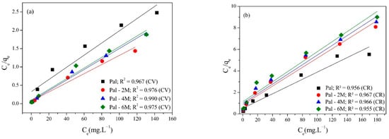 On the raw Brazilian palygorskite, the adsorption capacity values of the CV dye were higher than those measured for the CR dye. Such behavior can be explained in terms of the electrostatic attraction, since that raw palygorskite contains negative charges in its surface [,]. The maximum CV adsorption capacity was: Pal-2M (82.1 mg/g) > Pal-4M (69.4 mg/g) > Pal-6M (69.3 mg/g) > Pal (57.5 mg/g). Compared to the raw palygorskite, the amount adsorbed increased by 43%, 21%, and 20.5% for the Pal-2M, Pal-4M, and Pal-6M samples, respectively. This indicates that the adsorption performance of palygorskite for CV was improved with the acid-treatment. The amount adsorbed by raw clay was similar to the amount adsorbed by clay with R2+/R3+ ≈ 0.26 [], with a dioctahedral character. This indicates that clays with dioctahedral and dioctahedral-trioctahedral characters (as in the case of this work) have a similar CV adsorption capacity.