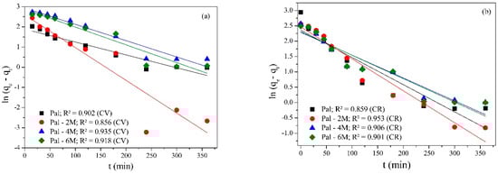 Figure 5a,b shows the amount of CV and CR adsorbed on the raw and acid-treated samples as a function of contact time. CV and CR solutions with initial concentrations of 50 mg/L, for a constant 20 mg clay sample mass and pH 7 were used to study the adsorption kinetics. Initially, the CV adsorption was fast for all samples, achieving about 40% of adsorption in the first 30 min. This is due to the numerous active sites available on the surface of the adsorbent in the early stages [] and the strong electrostatic interaction between the negatively charged palygorskite surface and the cationic CV []. When equilibrium was reached in 240 min, the adsorption capacity and CV removal values were 26.02 mg/g and 52%, respectively. The Pal-2M, Pal-4M, and Pal-6M samples removed approximately 92% (45.95 mg/g), 84% (42.1 mg/g), and 80% (40.38 mg/g) of the CV, respectively. For the CR dye, the adsorption kinetics was slower, and in 30 min, less than 18% of the dye was removed. The equilibrium was achieved in 240 min with the removal of 36.34% (18.17 mg/g), 25.12% (12.56 mg/g), 23.98% (11.99 mg/g), and 22% (11 mg/g) of the CR dye for the Pal, Pal-2M, Pal-4M, and Pal-6M samples, respectively.
