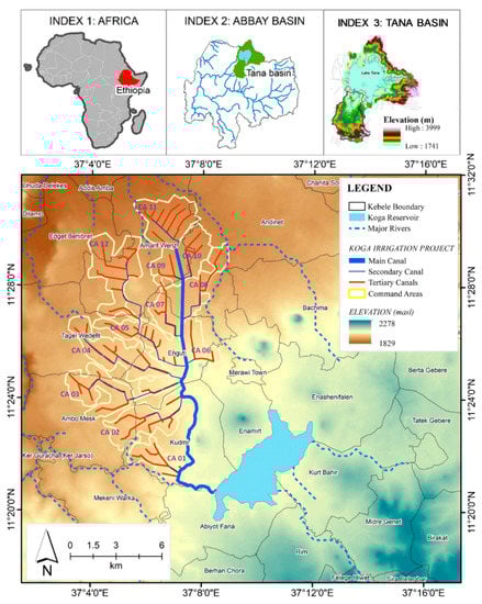 - Lijalem, G.A. Irrigation Performance Evaluation Using GIS and Remote Sensing, Case of Koga Irrigation Area, Upper Blue Nile Basin. Master’s Thesis, Bahir Dar University, Bahir Dar, Ethiopia, 2018. [Google Scholar]