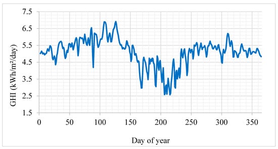 To conduct the necessary analysis and subsequent design of the microgrid, we used the downward shortwave surface radiation (SSRD) component provided by the ERA5-Land atmospheric reanalysis dataset, which extends back to 1981 (see []). Τhe aforementioned variable is the model equivalent of a pyranometer measurement and thus represents the amount of solar radiation reaching the surface of the Earth, or the so-called Global Horizontal Irradiance (GHI), which comprises both direct and diffuse solar radiation.