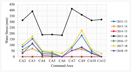 Annual water stress estimates (mm) in the case of wheat crops, for all studied command areas (CA) in the time period 2012–2019.
